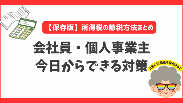 節税 【保存版】所得税の節税方法まとめ|会社員・個人事業主が今日からできる対策 2025年9月4日 moneylog100 『”金”肉ムキムキになろう』~おばあちゃんでも分かるお金の防衛術~ ヤッホー!"金"肉ムキムキ金ばぁやで。 FP2級(1級に挑戦中!) 老後資産5000万達成(まだまだ増やすで!) 今は1 …